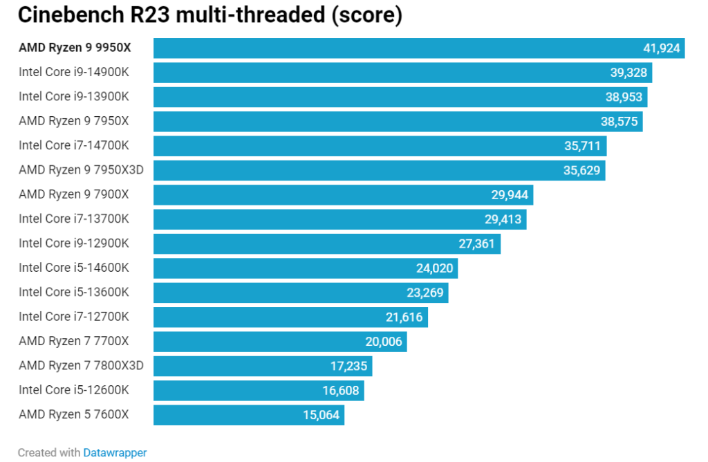 Ky rezultat u rrit në 43,895 pikë me Precision Boost Overdrive dhe me teknologjinë e re Curve Shaper shkon deri në 44,538 pikë. Versioni stock i procesorit prodhon një rezultat 41,924 pikë në Cinebench R23. Më afër këtij rezultati është Core i9-14900K me 39,328 pikë ndërsa paraardhësi shënonte 38,575 pikë.