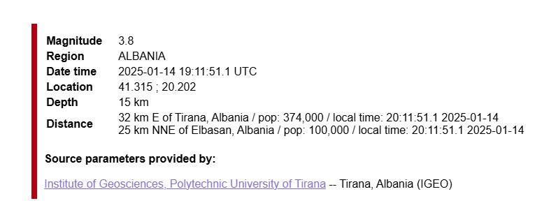 Sipas Qendrës Sizmiologjike Europiane të Mesdheut (EMSC), magnituda e tërmetit ishte 3.8 e shkallës Rihter, ndërsa epiqendra u lokalizua në qarkun e Elbasanit, në disa fshatra pranë Librazhdit.