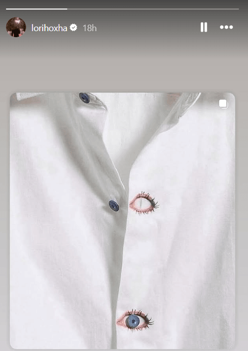 Në InstaStory, Lori ka shpërndarë një foto artistike të një këmishë të bardhë, ku vrimat e kopsave janë zëvendësuar me sy blu që duken sikur “vëzhgojnë”.